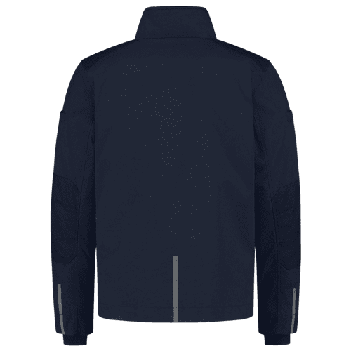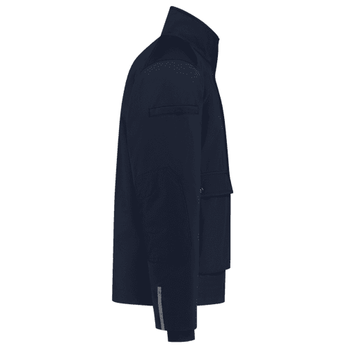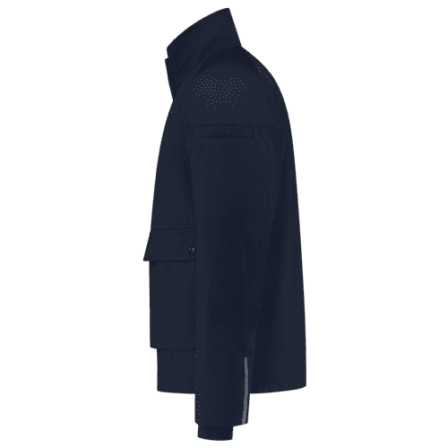 Model: 402014. Comfortabele werkjas met moderne uitstraling. Uitgevoerd met ribkraag in de hals, aansluitende rib tailleband. De rits wordt bedekt met een flap welke je kunt sluiten met drukkers. Verdekte zak in de ritssluiting. Zakken op het voorpand met een opening aan de bovenzijde en aan de zijkant. Twee kleine zakken op de bovenarmen. Extra reflectie op het achterpand en bij de polsen. Materiaal: 100% polyamide + TPU membraan. Gewicht: 220g/m².