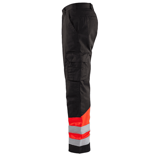 Licht van gewicht duurzame werkbroek uitgevoerd met 3 dubbel gestikte naden die voorzien in een grote scheurweerstand en hoge slijtvast baarheid. Waterafstotend en voorzien reflecterende strepen op de benen. Met ruime beenzakken, gulp met kunststof rits, lussen waarvan één D-ring, afneembare ID-kaarthouder en achterzakken. Beenzak met extra zak en pennenzak, beenzak met klep en plooi met pennenzak, extra zak, telefoonzak en ID-kaartzak. Kniebeschermerzakken aan binnenkant en met schuine zakken. De broek is gecertificeerd volgens EN ISO 20471 Klasse 1 (W) en EN 14404:2004+A1:2010 in combinatie met kniebeschermers 4027 en 4057. Materiaal: 65% polyester, 35% katoen. Gewicht: 240g/m².
